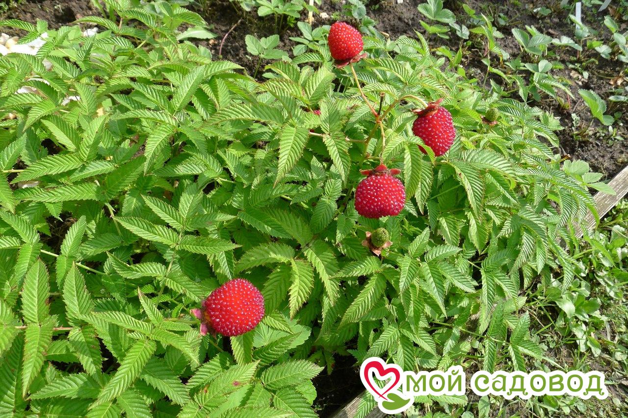 Малино-клубника — это не гибрид малины и клубники, как может показаться на первый взгляд. Это редкое растение — земляничная малина (розолин), но ее часто называют МАЛИНИКОЙ, соединив названия двух ягод. От малины плоды взяли типичную коническую форму, обволакивающую плодоножку, а от клубники бесподобный аромат, свойственный дикоросам. В результате получилась дивная, аппетитная ягода — вкусная и нарядная. Невысокий шипастый полукустарник, быстро разрастающийся по сторонам. Побеги нужно ограничивать, иначе он займет большую площадь. Первые цветы появляются уже в год посадки, но их желательно оборвать, чтобы растение как следует укоренилось и набралось сил. Зато на второй год куст порадует хорошим урожаем. Вес ягод — до 4 грамм, вкус кисло-сладкий.